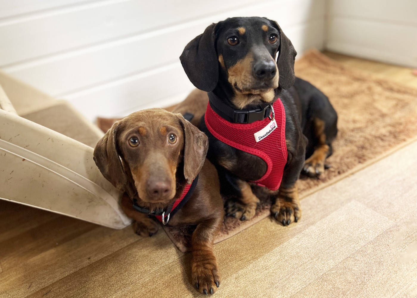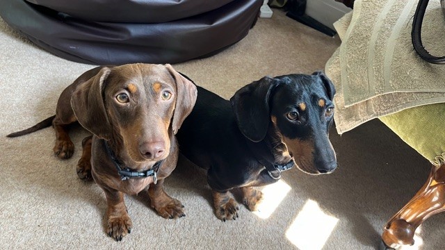 "When we first bought the girls home we weren’t able to catch them if they were off the lead, they didn’t know their names and they were timid and anxious about everything and everyone. The first few months were hard work as they couldn’t be left. There was a time I wasn’t sure I could cope with them. But they are so lovely and really really deserve a second chance at life. I’ve had dachshunds for more than 20 years and had a family of four which I bred previously. So I know the breed well. They can be stubborn. The girls weren’t house trained when they arrived, barked at everyone. Now, they are such good girls and have grown in confidence and continue to do so all the time. They absolutely have been worth persevering with. They love ‘their people’ and once they get to know new people they love them too. I can remember the first time they came up on the sofa voluntarily. They now snuggle with me on the sofa in the evenings and can’t get close enough, I have hardly sat down and they are on my lap. They are incredibly affectionate. They love my parents Labrador who lets them snuggle in bed with him. They also love to play chase with him in the garden. I don’t think they got the memo that they are Dachshunds not Whippets. They love spending the day in front of my parents Aga on the odd days when I have to go to the office for work. They love to play and wrestle and chase each other. They love walks in my village and walk well on the lead now and don’t seem to mind any weather as long as they can come home to their nice bed for a warm up and dry off. They are good a being left for short periods as long as they have each other and the radio on and a tasty chew. Wilma LOVES her toys, my neighbour donated them a whole toy box of unwanted toys from their dogs and she loves playing with them and has some particular favourites and seems to be such a baby. We were told they are sisters but I am convinced Wilma is Betsy’s daughter. Betsy appears a bit older and more sensible. Wilma is still a bit of a worrier. And can be a bit reactive at times. I am so pleased you kept them together, they are inseparable. Wilma has grown and they have both filled out and have fabulous shiny coats."